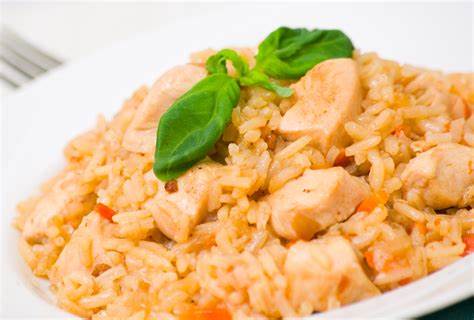 Arroz, queijo, frango, molho branco, tomate, pimentão e cebola.