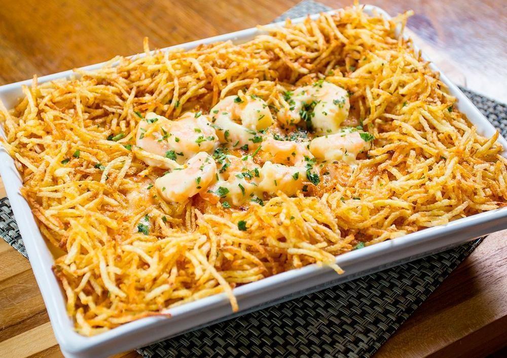 Arroz cremoso com ervilha e presunto, molho branco, camarão, queijo gratinado e batata palha.