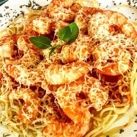 Macarrão, molho de tomate, camarão empanado e queijo gratinado.